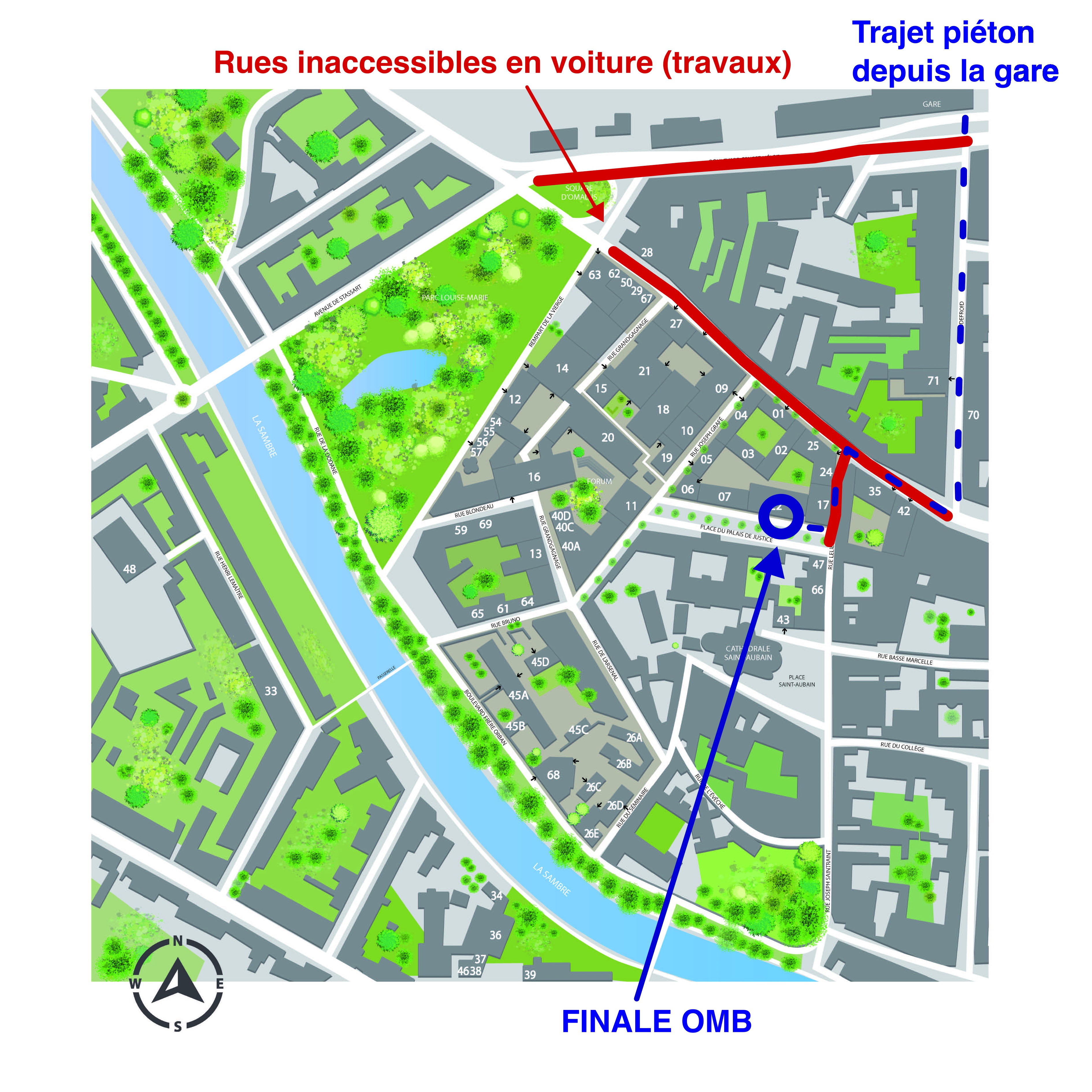 Accès au lieu de la finaleAttention, en raison de travaux d'aménagement de la ville de Namur, certaines routes sont inaccessibles aux voitures ! La seule façon d'approcher l'université en voiture est par le côté Sambre - Place Saint-Aubain.