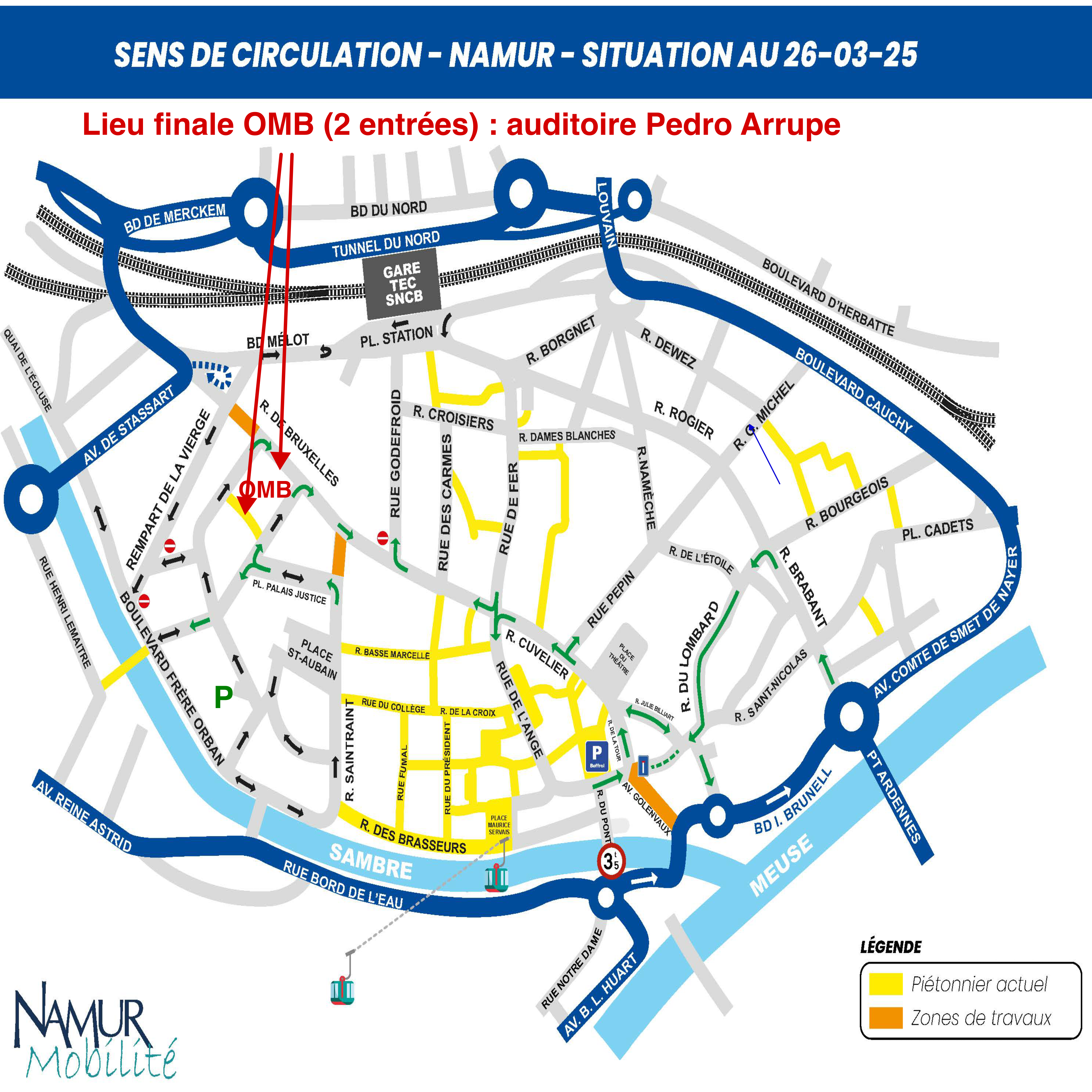 Attention : en raison d'aménagements en cours de la ville de Namur, les sens de circulation autour de l'université viennent d'être récemment modifiés ! Ils sont indiqués dans le plan.