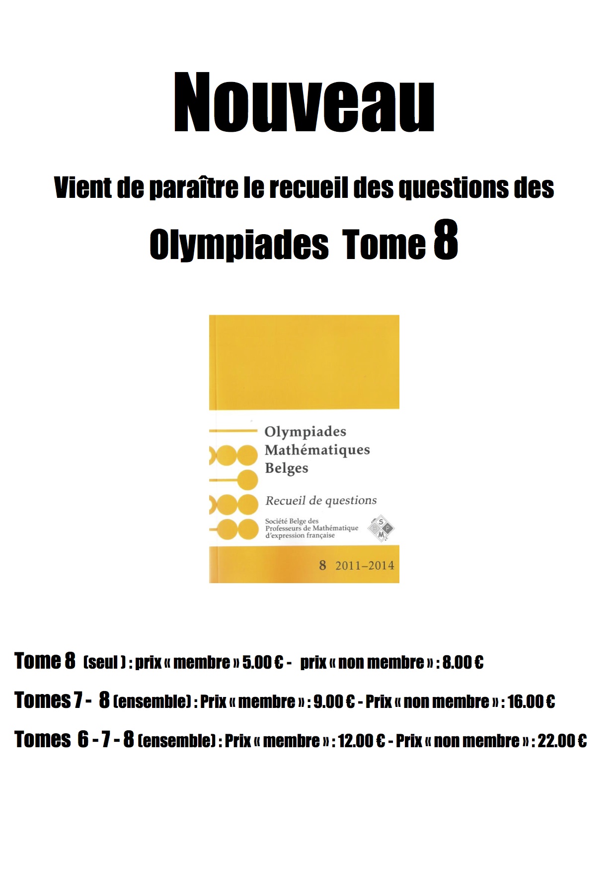 Recueil n°8 reprenant les questions des éliminatoires, demi-finales et finales de 2011 à 2014. Les tomes 6 et 7 peuvent également encore être commandés auprès de la sbpm.